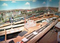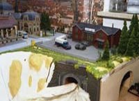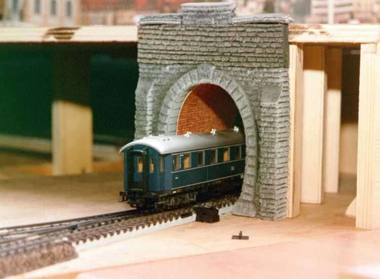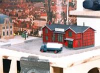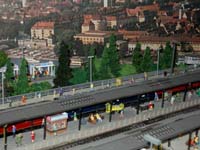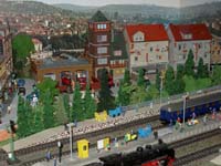 Und weil ich das von Kassel abgeguckt habe, gibt es zwischen Bahnhofsstraße und Bahngleisen ein kleines Tannenwäldchen. Inzwischen liegt auch die Bahnhofsstraße wieder an Ort und Stelle. Die Bilder veranschaulichen meines Erachtens recht gut, dass sich alles harmonisch mit miteinander verbindet. Der Bahnhofsbereich ist ja oft eine interessante Gegend für Investitionen, und so hat sich die Schraubenfabrik Krämer in seiner Nähe angesiedelt. Eine Etage tiefer sieht man die Tunneleinfahrt zum unterirdischen, videoüberwachten Schattenbahnhof, der im übrigen der einzige Bereich meiner Anlage ist, der mittels Computer und WinDigipet gesteuert wird. Man kann