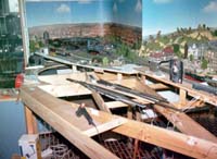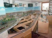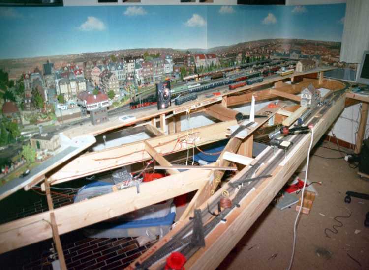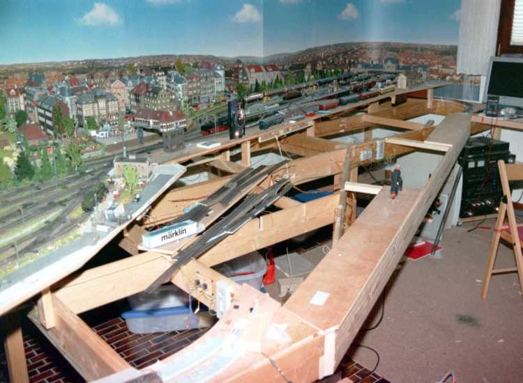 Angeregt durch einen Bericht in einer älteren Märklin-Magazinausgabe hatte ich mir nämlich in den Kopf gesetzt, dort die Lokomotiv-Fabrik Henschel & Sohn entstehen zu lassen. Doch leider war der zur Verfügung stehende Platz wohl doch ein wenig zu klein. Was tun sprach Zeuss???? Ganz einfach meinte ein Freund, dass Dreieck samt Paradestrecke weiter nach vorne rausziehen und schon hast du genügend Platz. Zuerst scheute ich mich diese Arbeit auf mich zunehmen, da mir eigentlich der Sinn nach Fahren und nach einem Gleisbildstellwerk stand. Aber dann lies ich mich doch überzeugen und ruckzuck wurde der Umbau geplant und durch gezogen.