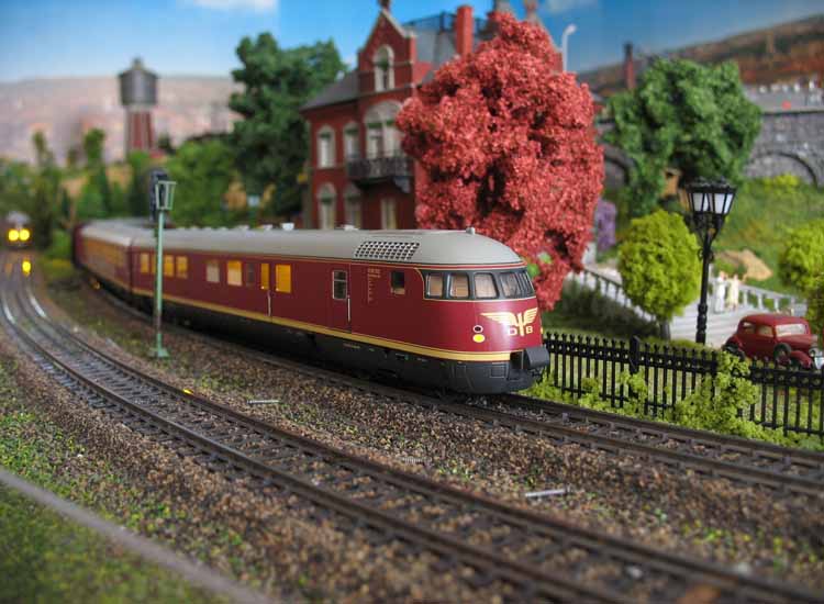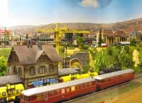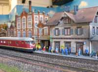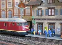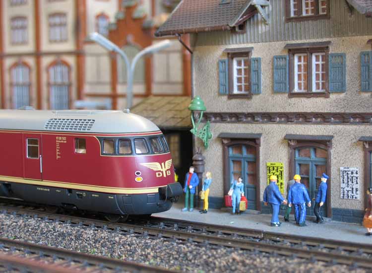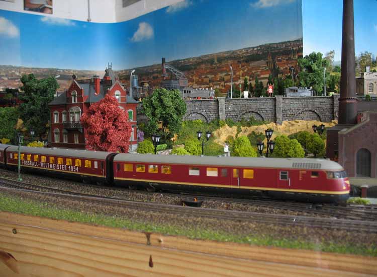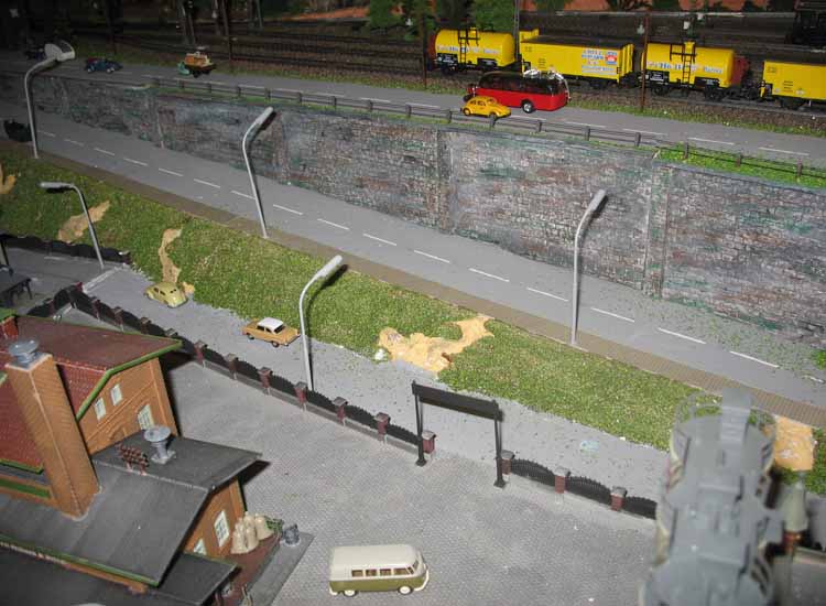 Doch nun ist es endlich soweit. Ich habe Muse und vor allem auch Lust hier wieder zu berichten. Eine neue Struktur habe ich mir überlegt. Und zwar will ich nun jährliche Blöcke erstellen, damit man sich ein Bild darüber machen kann was in all den Jahren geschehen ist. Beginnen will mich mit Jahr 2006: Im Vordergrund stehen Ausbau- und Verschönerungsarbeiten, aber auch eine Fahrt mit dem VT-08 von Würzburg nach Göppingen und ein Besuch des Miniaturwunderlands in Hamburg. Mehr zu diesen beiden Fahrten an anderer Stelle. Da wird zum Beispiel hinter der "Henschelei" ein kleiner Park angelegt, indem die Mitarbeiter sich in Ihren Pausen bei schönem Wetter erholen können. Weiterhin wird der Bahhofsvorplatz vom Bahnhof Unterstadt gestaltet und im Museum treffen die ersten Besucher ein. Und schon sind wir im Jahr 2007: Der Bahnhof Unterneustadt ist bevölkert und die ersten Triebwagen bringen die Mitarbeiter in ihre Firmen. Im Vordergrund stehen in diesem Jahr selbst hergestellte Mauern. Diese bestehen aus in Siliconformen gegossenen flüssigem Gips, der nach dem Aushärten farblich behandelt wird. Ein dreiteiliges Stück, das später abnehmbar sein soll, wird auf ein zu geschnittenes Sperrholzstück geklebt. Anschließend wird noch ein Zaun montiert und schon kann es eingebaut werden. Außerdem sind meine "Preisserlein" zur Neige gegangen, und ich muss mal wieder zu Pinsel und Farbe greifen, da ich fast all meine Figuren selbst bemalt habe. Ein Höhepunkt des Jahres ist dann schließlich noch die Erprobung des neuen VT 08, des Weltmeisterzuges von 1955. Ein schönes Modell mit überzeugenden Fahreigenschaften.