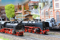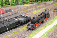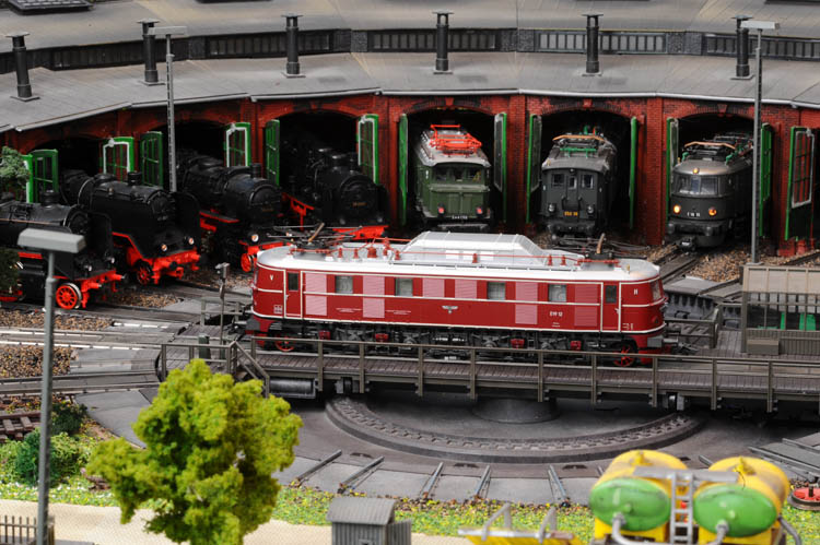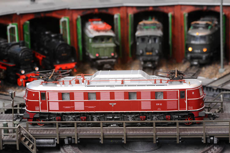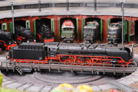 Eigentlich sollte die BR 10 in rot für 10-jährige Insider-Mitgliedschaft nur in der Virtrine stehen, aber als "Farbklecks" war sie dem Fotografen hochwillkommen. Manchmal stehen auch Altbau-E-Loks im Schuppen und auf der Drehscheibe, da es einen separaten Lokschuppen für die noch geringe Zahl an Elektrolokomotiven nicht gibt. Und gerade wird auch die schwerste Güterzuglokotive gedreht, die deutsche Reichsbahn je hat bauen lassen. Kriegsbedingt verließen aber nur 26 Stück die Werkshallen der Firma Henschel & Sohn in Cassel.