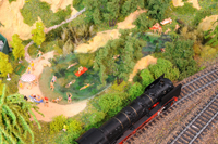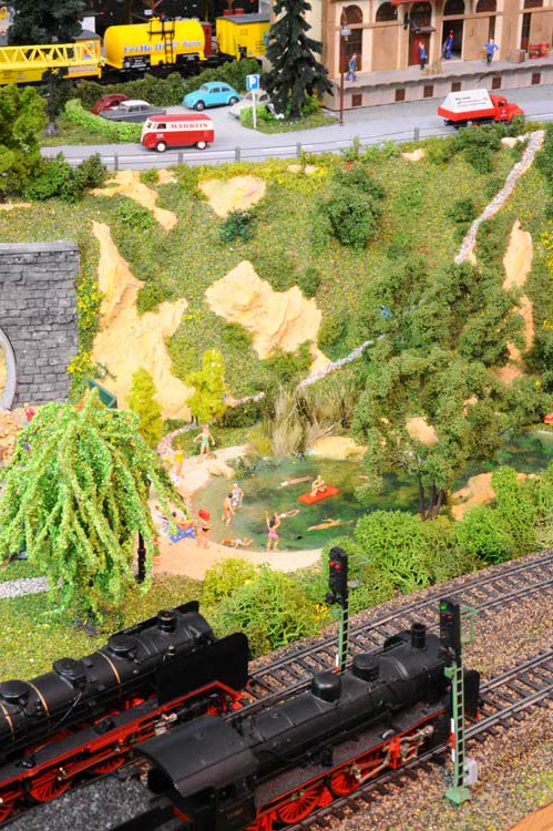 Die vollendete Schönheit liegt im Detail. So kann man zwar auf einem Bild eine Dampflok erkennen, aber erst die Nahaufnahme läßt erkennen um welche es sich handelt. Die Baustelle des Straßentunnels sieht sicher imposant aus, aber erst durch die Nahaufnahme erkennen wir, wieviele Bauarbeiter dort arbeiten. Ein See mit Badenden, na schön. In der Nahaufnahme erkennen wir sogar, dass es dort auch einen FKK-Bereich gibt. Fünf Nahaufnahmen aus dem BW, lassen uns ahnen, mit wieviel Liebe zum Detail gearbeitet wurde. Interessante Perspektiven bieten auch die ersten 3 Fotos der unteren Reihe.