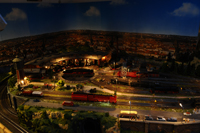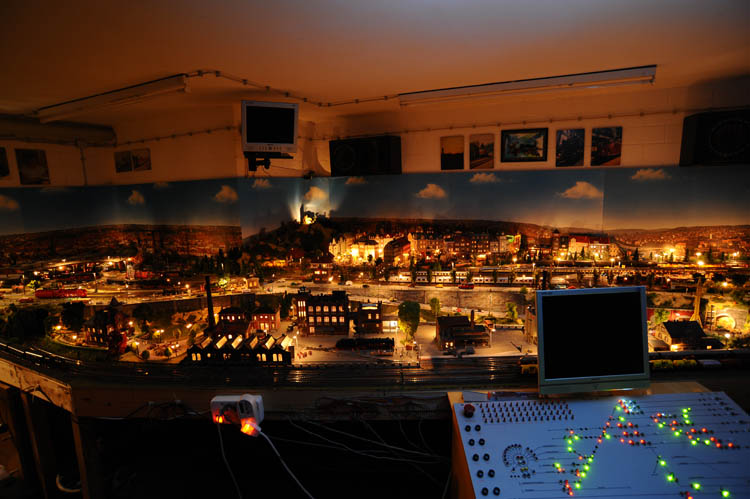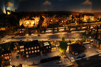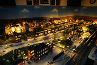 Ja und nun wird es Nacht auf der Modellbahnanlage. Die Lichter sind angegangen und sie strahlt in ihrer ganzen Schönheit. Eine ganz besondere Atmophäre. Zwei Transformatoren mit jeweils 10 Ampere, aufteilt in jeweils 4 Stromkreise sorgen für diese schöne Stimmung.