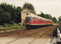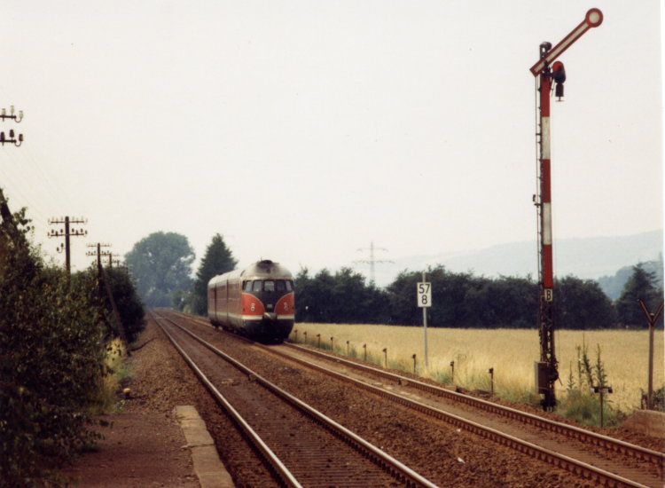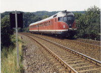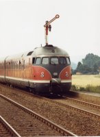 Von Kreiensen aus fahren wir dann an die wichtigste Strecke des VT 08 überhaupt, nämlich die Strecke von Kreiensen über Goslar nach Braunschweig. Hier gibt es noch keine Oberleitung und hier war seine Domäne in den letzten Jahren. An einem Bahnübergang in der Nähe von Orxhausen machen wir Station Auch Olli steht mit seiner Kamera bereit. Und unsere Geduld wird durch die guten Recherchen von Ulli auf keine allzulange Probe gestellt. Der VT 08 aus Richtung Kreiensen fährt schon recht bald an uns vorbei, vobei an einem nostalgischen freie Fahrt zeigenden Flügelsignal. Und wie das so ist bei der Bahn, auch der Gegenzug läßt nicht allzulange auf sich warten. An dieser Stelle endet nun mein kleiner Bericht vom großen VT 08. Doch da meine Lieblingsfirma ihn ja im letzten Jahr als INSIDER-Modell auf den Markt gebracht hat, dreht er inzwischen auf meiner Anlage seine Runden und ich habe mir überlegt, auf der nächsten Seite ein paar Fotos von seinem Einsatz auf meiner Anlage folgen zu lassen.